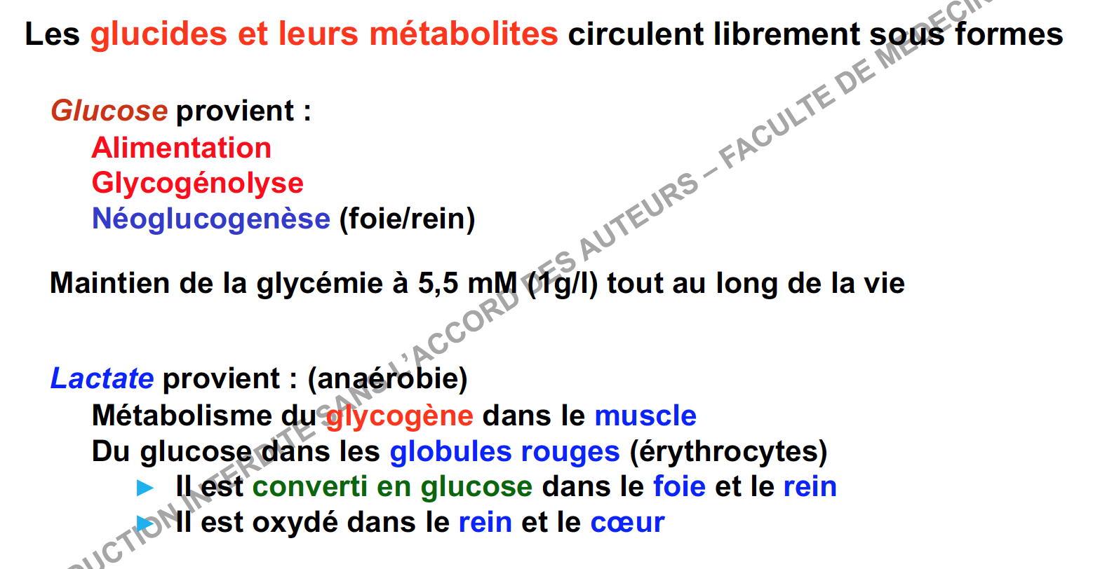 "C) Le lactate qui provient du glucose (dans les erythrocytes) ou du glycogène (dans le muscle) est : soit converti en glucose dans le foie et les reins, soit oxydé au niveau des reins ou du coeur."