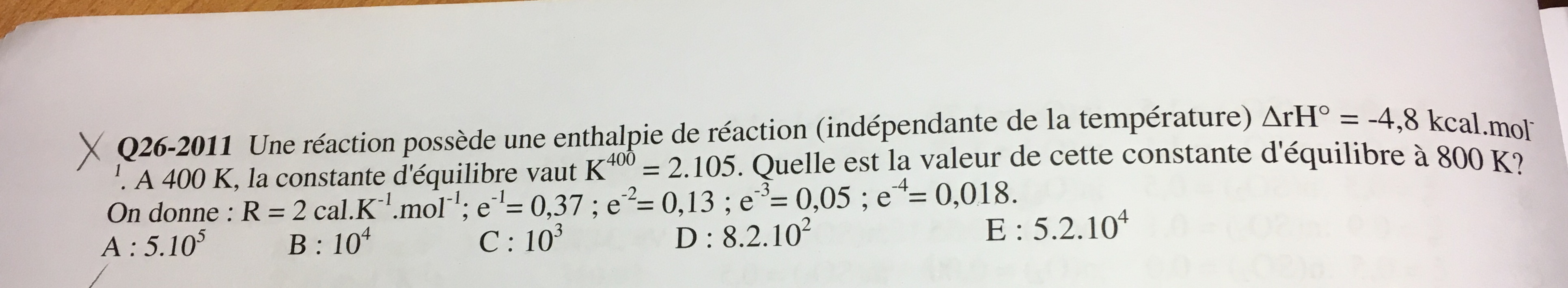 , Il s'agit d'un qcm sur la stœchiométrie, c'est l'application de la dernière formule du cours; d'après mes calculs je tombe sur une exponentielle -6 mais la simplification n'est pas proposée dans l'énoncé.
