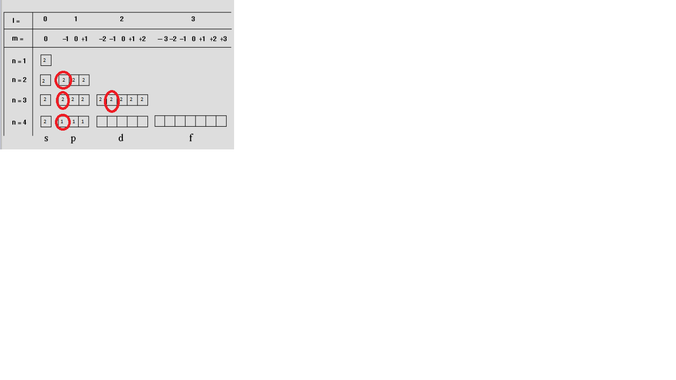 Dans les orbitales atomiques en gras, on a nos électrons m = -1 donc ça nous en fait 2 dans chaque l'orbitale 4p3 où il y en un seul