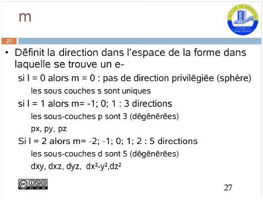 Le nombre quantique m : définit l'orientation, la direction de l'orbitale [...] pour chaque sous-couche"
