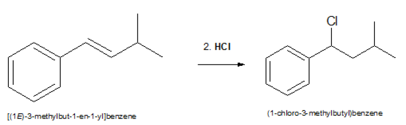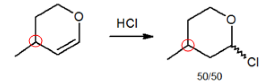 Dans une hydrohalogénation passes par un carbocation. Tu vas donc essayer de passer par le carbocation le plus stable. (Markovnikov)
