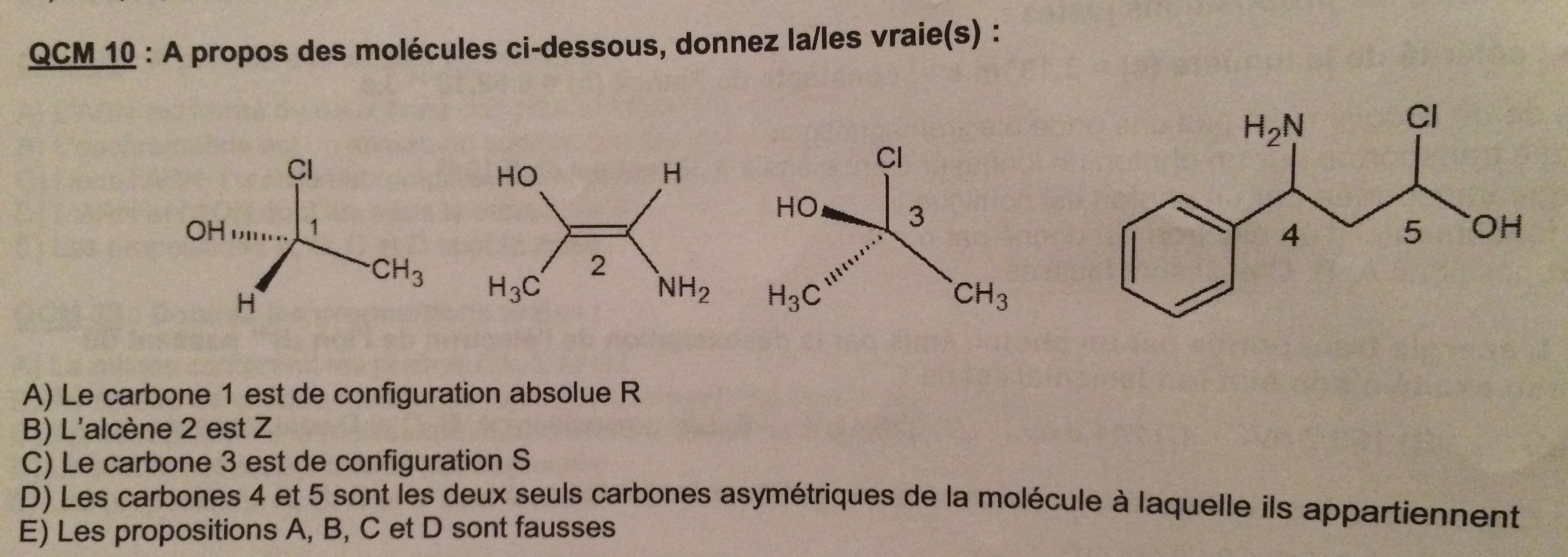 L'item qui me pose problème est le B, parce que il est indiqué qu'il est faux, car la molécule est en mésomérie E et pas Z. Mais pourtant j'ai vraiment l'impression que les deux groupes les plus importants (H3C et NH2) sont situés du même côté (en bas), ce qui donne bien une mésomérie Z