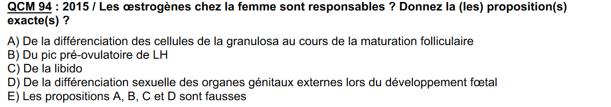 La A est vrai. Les oestrogènes n'interviennent pas DIRECTEMENT sur la différenciation des cellules de granulosa, (contrairement à leurs effets sur la prolifération de ces dernières) Mais interviennent indirectement via le pic de LH.