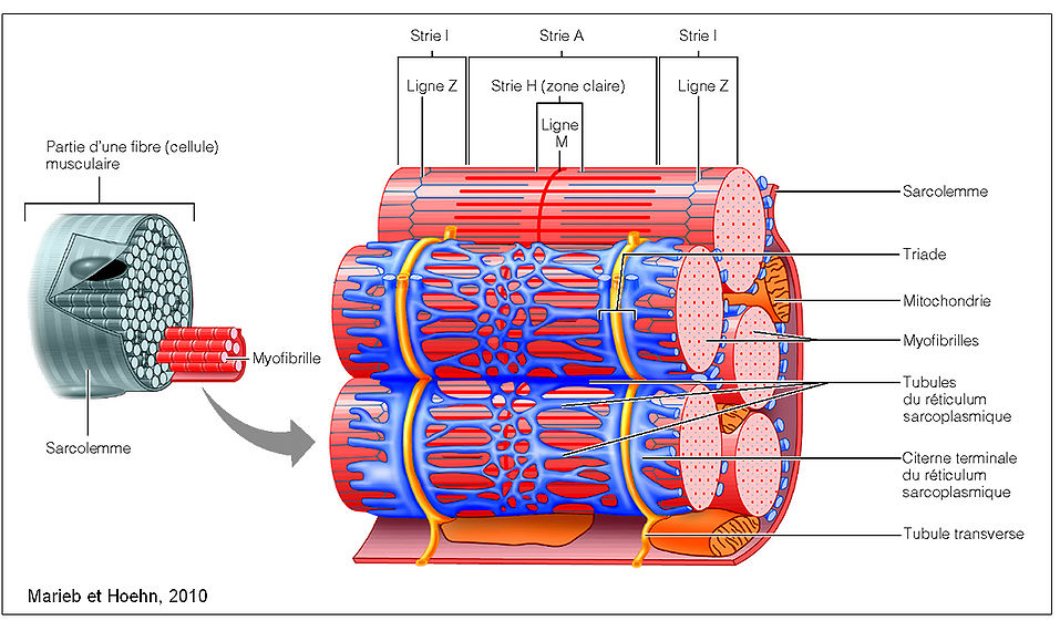 Au sein d'une cellule musculaire, tu vas retrouver plusieurs myofibrilles, elles-mêmes constitués de plusieurs sarcomères les uns à la suite des autres.