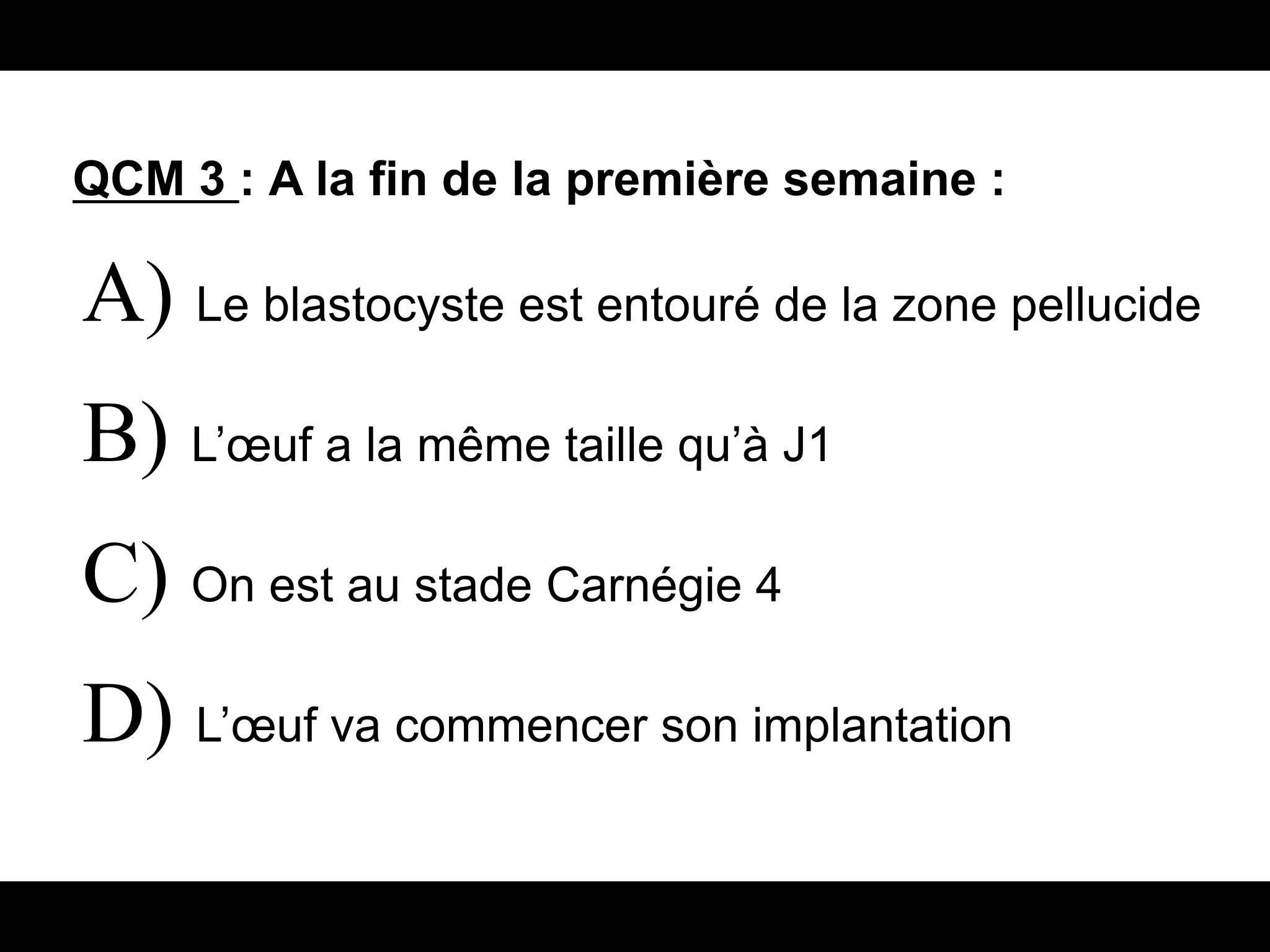 La réponse est BD mais j'avais mît que D, je ne suis pas d'accord avec la B car à la fin de la première semaine on a plus de zone pellucide (hatching) du coup le blastocyste est libre et il va pouvoir prendre le volume qu'il veut, il ne sera plus contraint par la zone pellucide à garder le même volume ! En plus l'item A n'est pas compté juste alors bon...