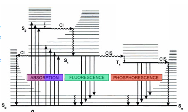 Alors en fait pour chaque niveau, t'as differents sous niveaux énergétiques qui le composent. Ça te permet notamment de faire des transitions non radiatives, qu'il s'agisse de relaxations vibrationnelles/CIS/CI..