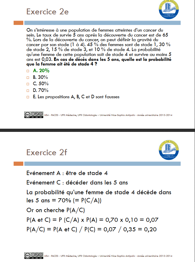Or nous on veut la probabilité de décéder et non de survivre dans les 5 ans donc on fait 1-0.3 = 0.70 donc c'est ce qui nous donne P(C/A) dans la correction du prof.