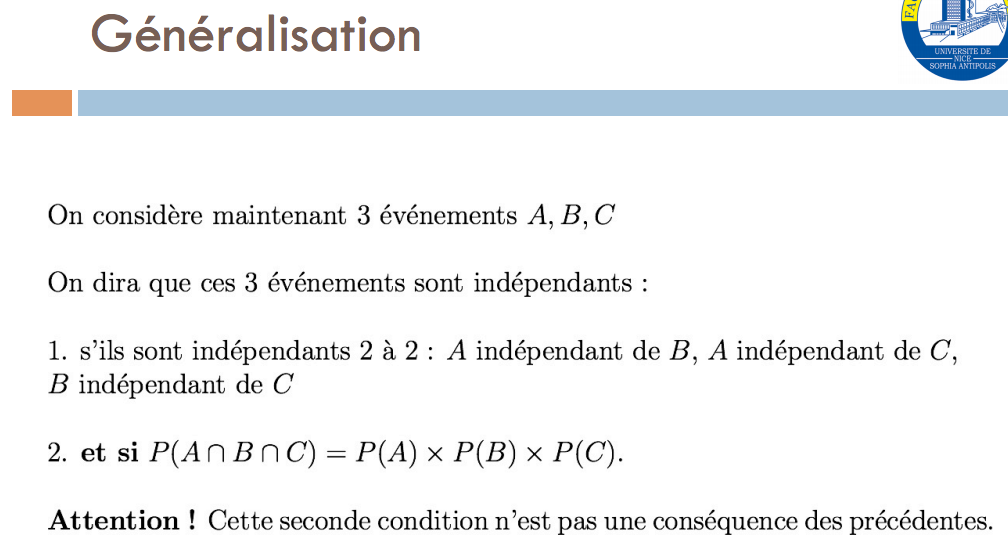 :arrow: 3 événements indépendants <=> P(A inter B inter C) = P(A)xP(B)xP(C) et les événements indépendants 2 à 2 : A indep de B, A indep de C, B indep de C