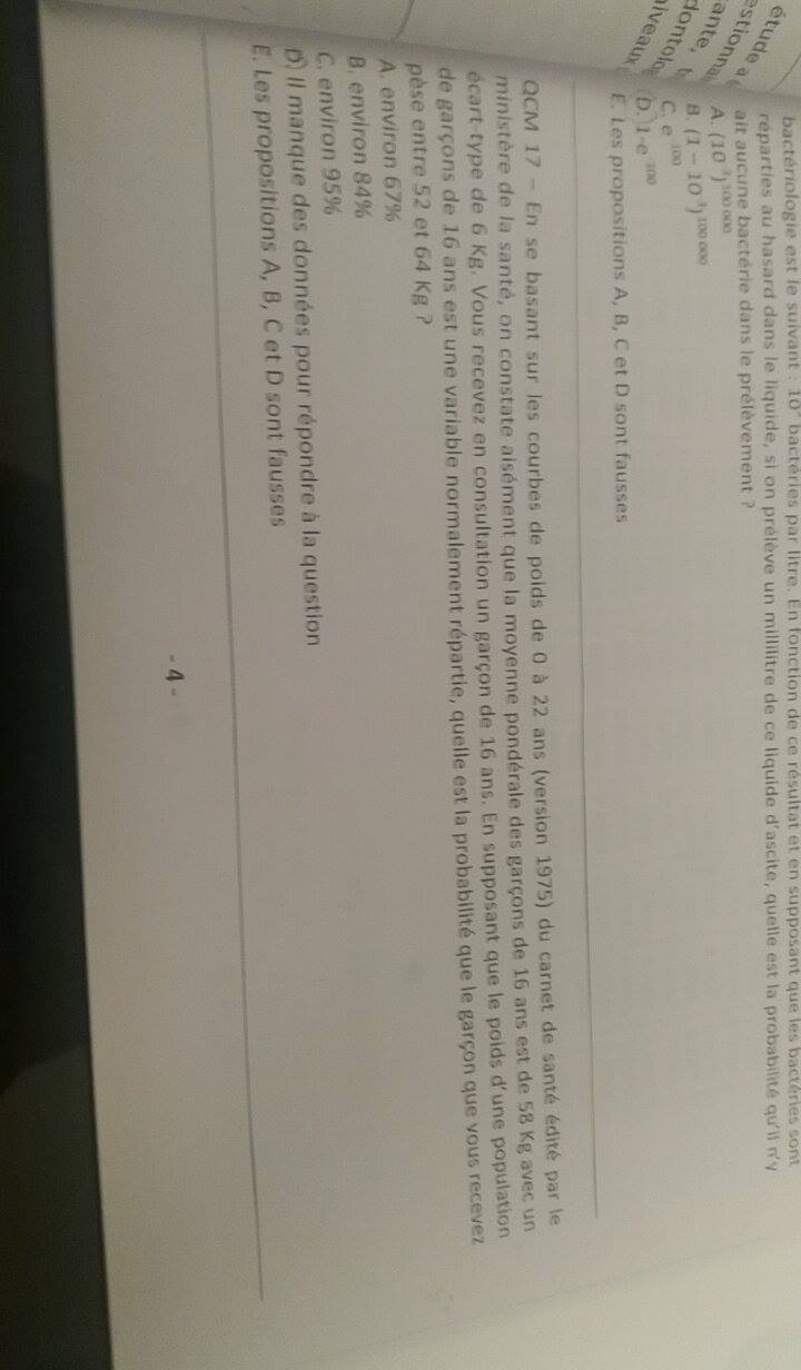 Il faut que tu utilises la courbe de Gauss ! Tu vois que le poids doit être compris entre 52 et 64 kg ce qui correspond à la moyenne (=58kg) +/- l'écart-type (6kg) ce donc correspond à 68.2% de la population donc à 67% environ ! C'est bon pour toi ?