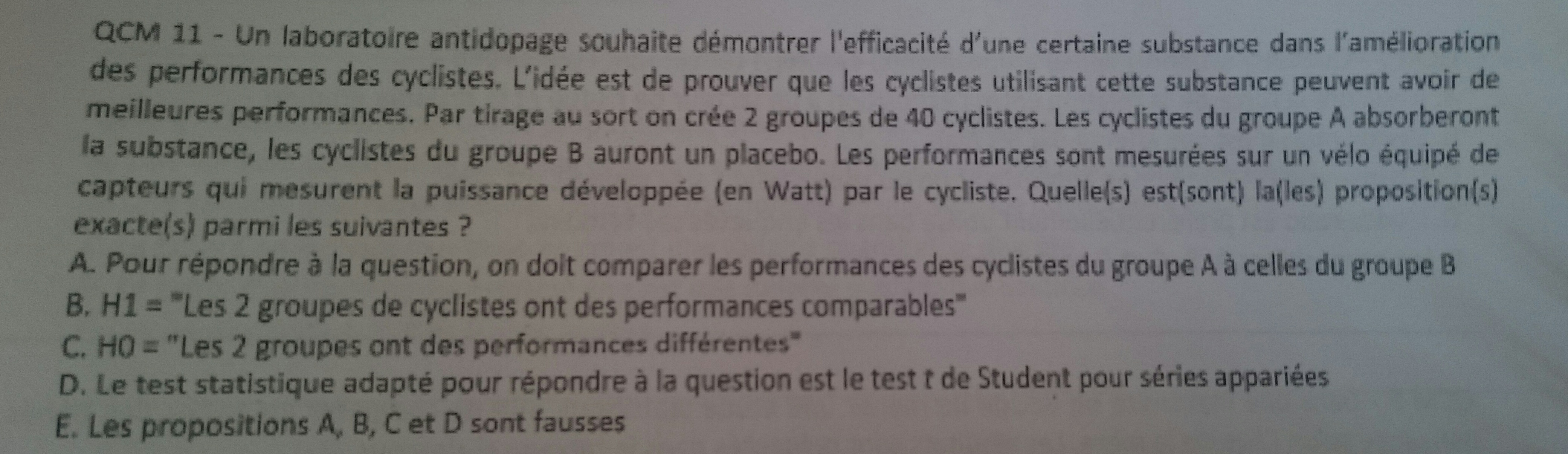 Selon moi, dans tous les cas cet item serait faux car on ne fait pas le test en mode séries appariées, vu que ce sont deux groupes de cyclistes indépendants :p