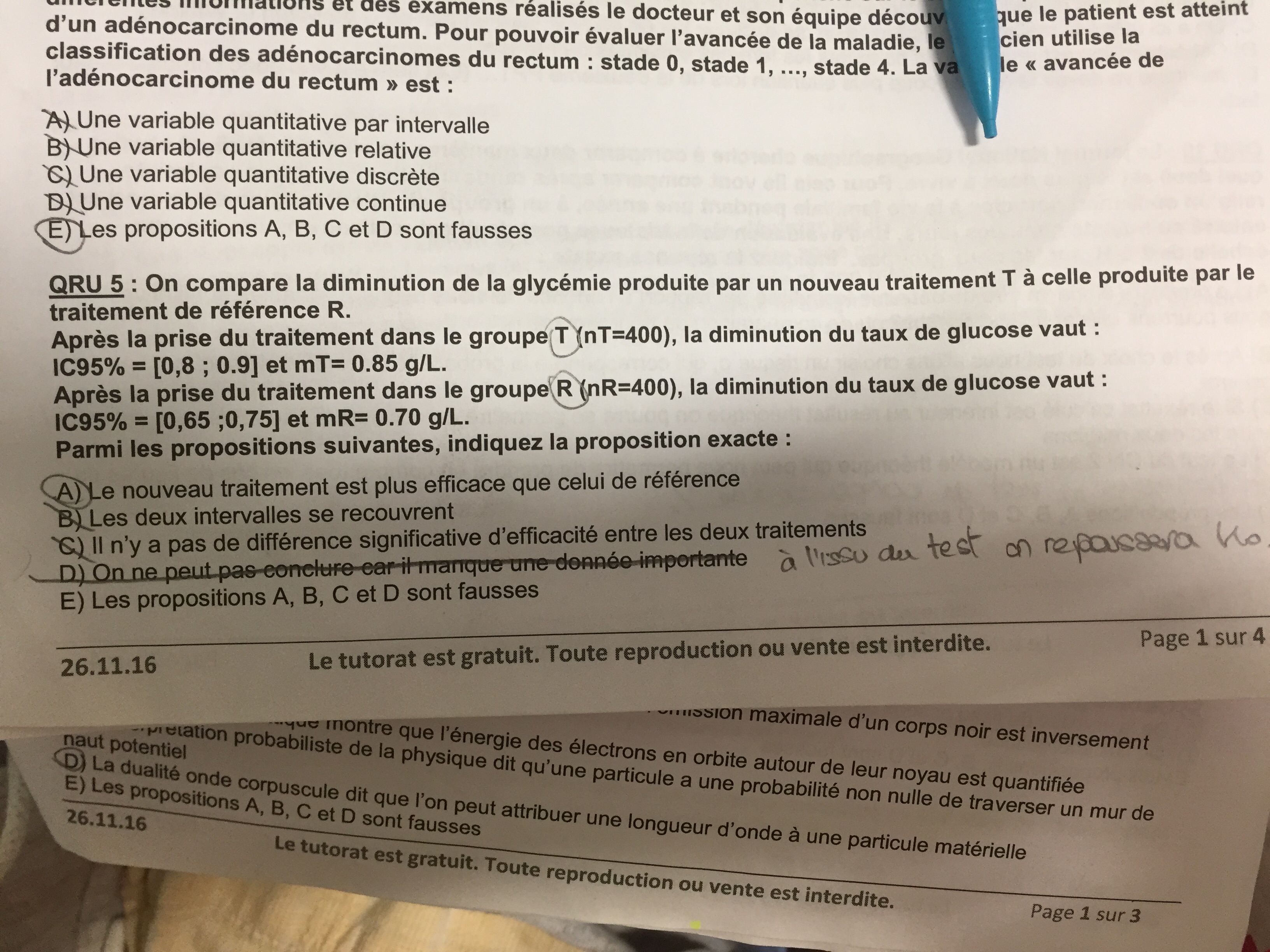 J'aurais dit A parce que les intervalles ne se chevauchent pas donc ILS sont significatifs et LA moyenne DE diminution de la glycémie dans le groupe T (nouveau traitement) est PLUS IMPORTANT QUE celui du groupe R (traitement de référence).