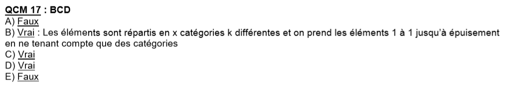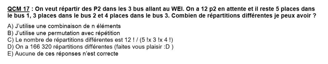 Dans l'item C de la Q17 Chap 4, on nous demande calculer le nombre de répartition différente, mais en se servant de la formule de l'item b (qui est compté vrai) je ne retombe pas sur le résultat donné (qui est vrai lui aussi) alors j'aurais aimé savoir quel est la formule à utilisée pour retomber sur 166 320 ?