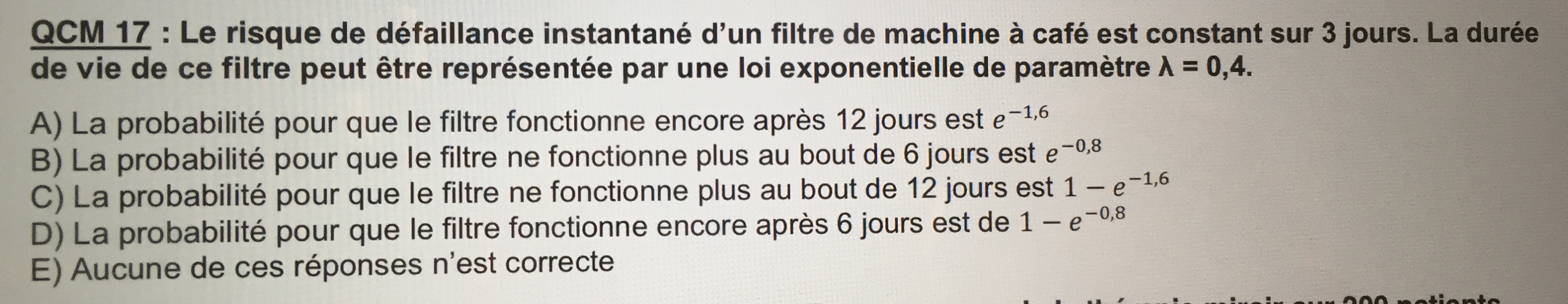 Bon, j'ai un problème avec ce QCM car pour moi, la loi exponentielle qui est une variable aléatoire continue, lorsqu'on demande la probabilité que X=quelque chose ça vaut 0 ! Or la correction est AC et moi j'aurais mit seulement A pour la raison précédente, car je pensais que ça valait 0 (c'est peut être que j'interprète mal la formulation de l'item aussi...)
