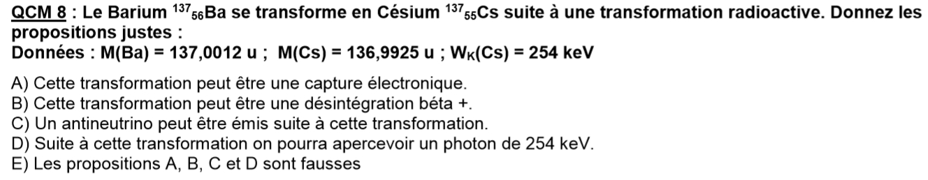 Concernant ce QCM, je ne comprend pas pourquoi la réponse D est fausse..? Je pensais qu'on pouvait avoir des photons de fluo émis, suite à une capture électronique..? Peut-être que ce photon doit avoir une énergie égale à l'énergie Couche K - L par exemple ?