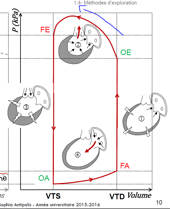 De FA à OE, le ventricule rempli de sang se contracte (toutes les valves sont fermées) et la pression ventriculaire va augmenter jusqu'à devenir supérieure à celle de l'aorte, c'est ce qui se passe en OE. Ici, la pression ventriculaire aura tendance à pousser les valves d'éjection dans leur sens d'ouverture, donc en direction de l'aorte, tandis que la pression aortique les poussera vers le ventricule, donc aura tendance à les fermer).