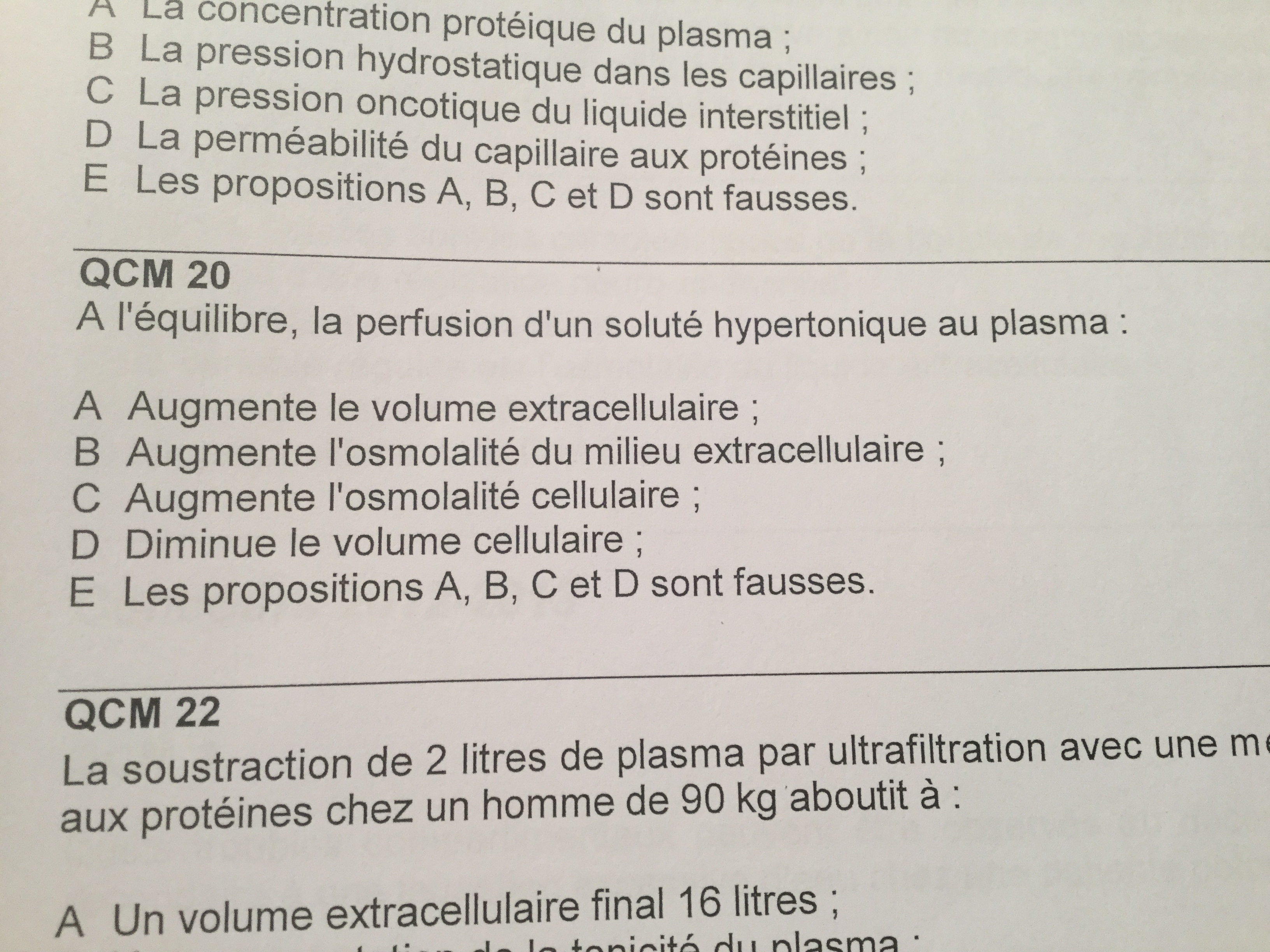 Salut, :) j'ai un prblm avec ce qcm: rep ABCD mais je comprend pas pk l'osmolalite cellulaire ET du milieu extracell augmentent, pour moi c'est l'ormolalite cellulaire qui diminue vu qu'on met une solution HYPERtonique donc déshydratation..... voilà j'espère que c'est compréhensible ce que j'ai dit ! MERCI d'avance :P