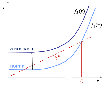 Comme tu le vois sur ce schéma, la tension augmente grâce au vasospasme, ce qui fait qu'on perd l'intersection entre la droite de Laplace et la courbe caractéristique : le vaisseau se collabe, ce qui provoque une ischémie (mais qui protège donc toujours du saignement).