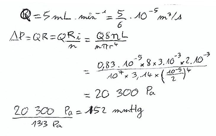Sinon tu as la bonne méthode, le seul pb c'est pour le débit , 5mL/min = 5 x 10^-6 m3/min = 5/6 x 10^-7 m3/s (et pas 10^-5!)