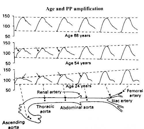 En effet dans son cours le prof dit : Pour un sujet âgé les vaisseaux sont plus rigides et la différence entre pression aortique et celle de la périphérie est faible "