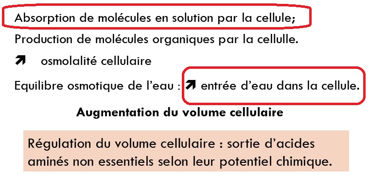 mais dans son cours après le prof généralise un peu la chose, c'est-à-dire qu'ici la concentration des osmoles dans la cellule augmente (par exemple suite à l'ingestion de glucose en présence d'insuline), eh bien ces osmoles ne vont pas forcément s'équilibrer de suite de part et d'autre de la membrane, puisque la cellule a peut-être besoin de les consommer pour plus tard. Ainsi l'eau va suivre le mouvement des osmoles et rentrer dans la cellule pour effectuer un équilibre osmotique