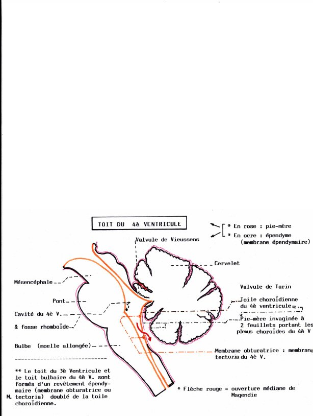 Ensuite tu vois sur ce schéma (coupe sagitale du cervelet et du TC) que la membrana tectoria(trait orange ) est plus antérieure que les voiles, elle ne sera donc pas visible sur une vue postérieure car "cachée" par les voiles médullaires.