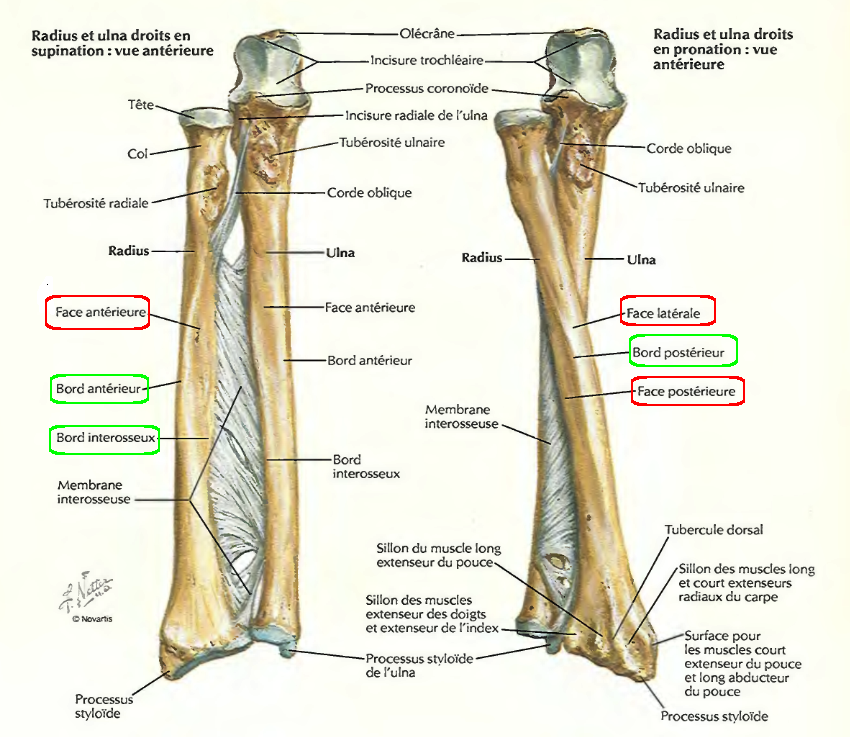 La surface circonférentielle comme son nom l'indique n'est pas que sur la face latérale du radius mais elle fait pour ainsi dire tout le tour de la tête du radius car il ne faut pas oublier qu'il y a au niveau de l'avant-bras un mouvement de prono-supination entre le radius et l'ulna et qui est justement en autre permis par cette surface circonférentielle