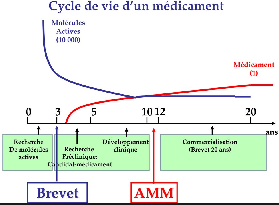 J'ai juste une petite question concernant cet item : Il faut compter 20-25 ans entre la première étape qui est la recherche de la molécule active et la disparition du médicament