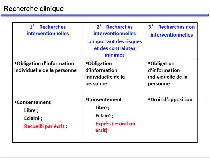 :arrow: 2ème tableau : Là on te dit que la personne doit donner l'équivalent de son consentement libre et éclairé, après avoir eu toutes les informations sur la recherche. En gros déclaration de non-opposition, c'est un peu comme le consentement mais en moins strict. Je reprends l'exemple que le professeur a donné en cours : ce qu’on fait signer au patient ou à la personne, c’est dire « voilà j’ai été informé que je participe à telle recherche non interventionnelle, je ne m’oppose pas à ce que la recherche soit réalisée avec les informations me concernant. ».