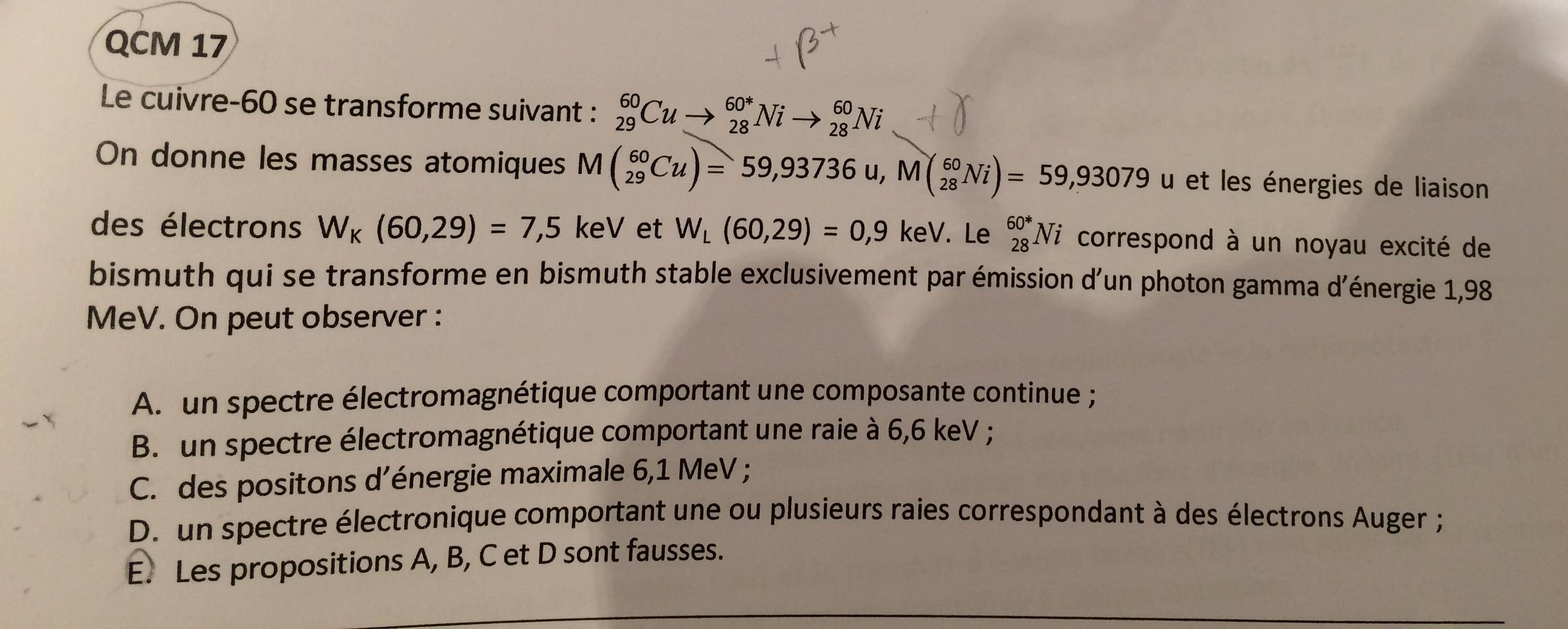 Mais pourquoi alors l'item A est faux ? On parle de spectre électrique pour une émission B+ et B- et électromagnétique pour les photons ? :)