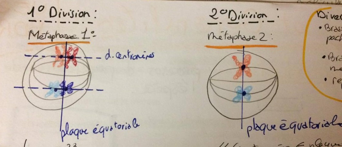 De ce que j'ai compris, en fait tu regarde les centromères des K des paires homologues qui sont donc appareillés en Métaphase 1 et tu trace une droite. Et du coup cette droite sera perpendiculaire à la plaque équatoriale. Du coup en M1 perpendiculaire et parallèle en M2. Et du coup la mitose c'est comme la M2 parallèle.