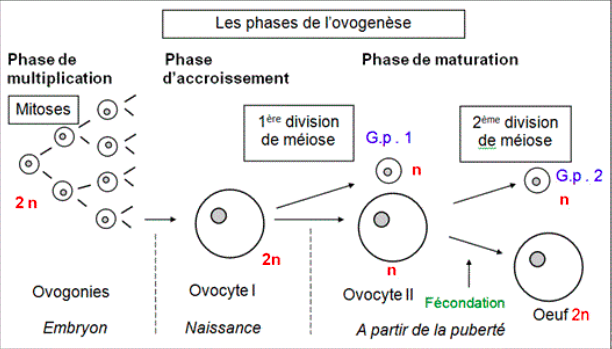 L'ovogénèse est bloqué à 2 reprises : en Prophase 1 et en Métaphase 2