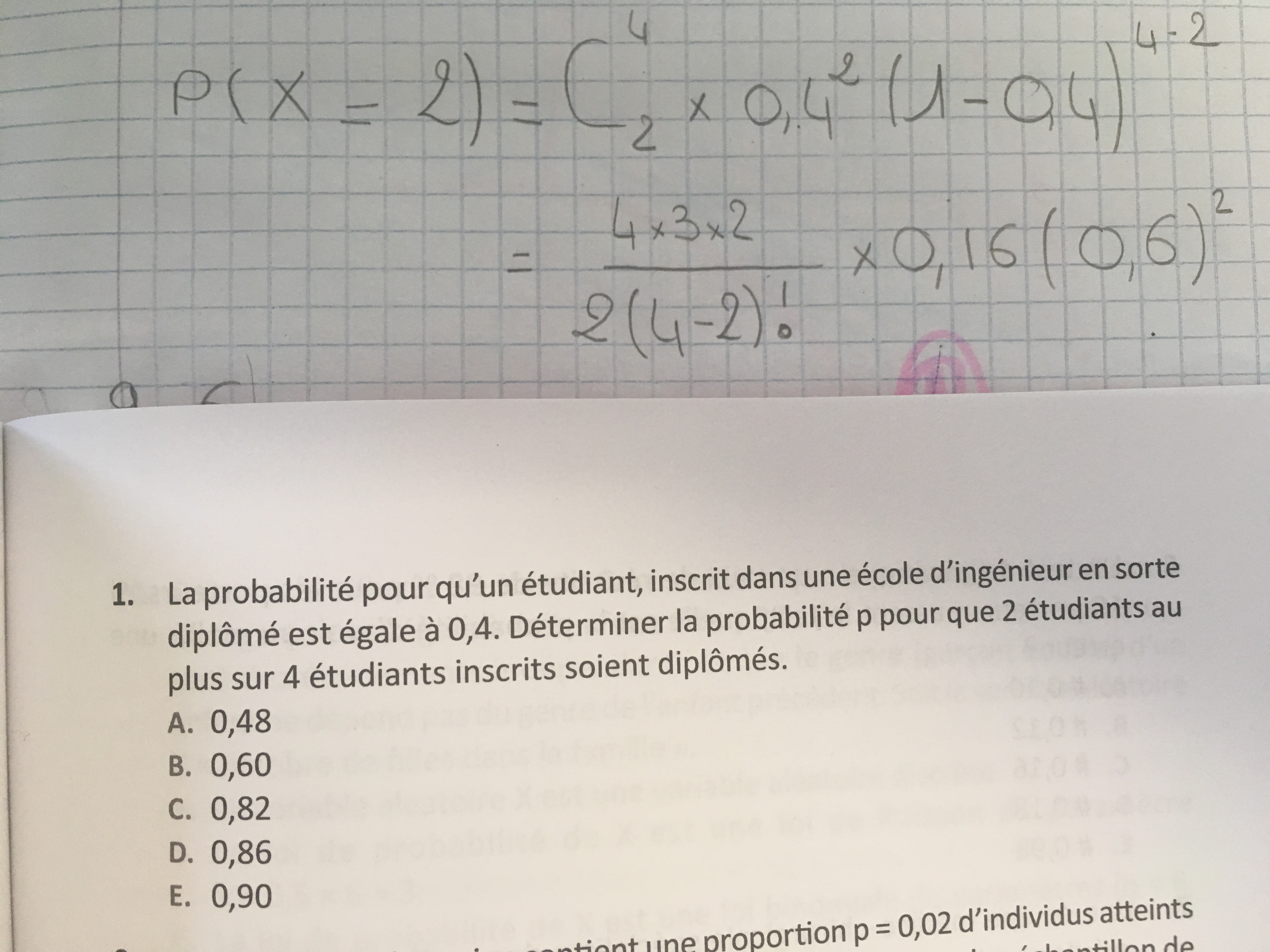Alors ici le truc bizarre c'est que le prof utilise la loi binomiale alors qu'il ne donne aucun indice nous laissant penser qu'il l'utilise.. Bref, malgré tout, c'est la seule loi qu'on peut utiliser dans ce genre de cas donc ça passe!