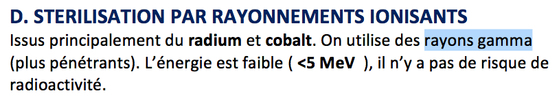 Salut ! La stérilisation par rayonnement se fait avec des rayons gamma car ils sont très pénétrants et sont de faible énergie donc comptent moins de risque de radioactivité :glasses-nerdy: