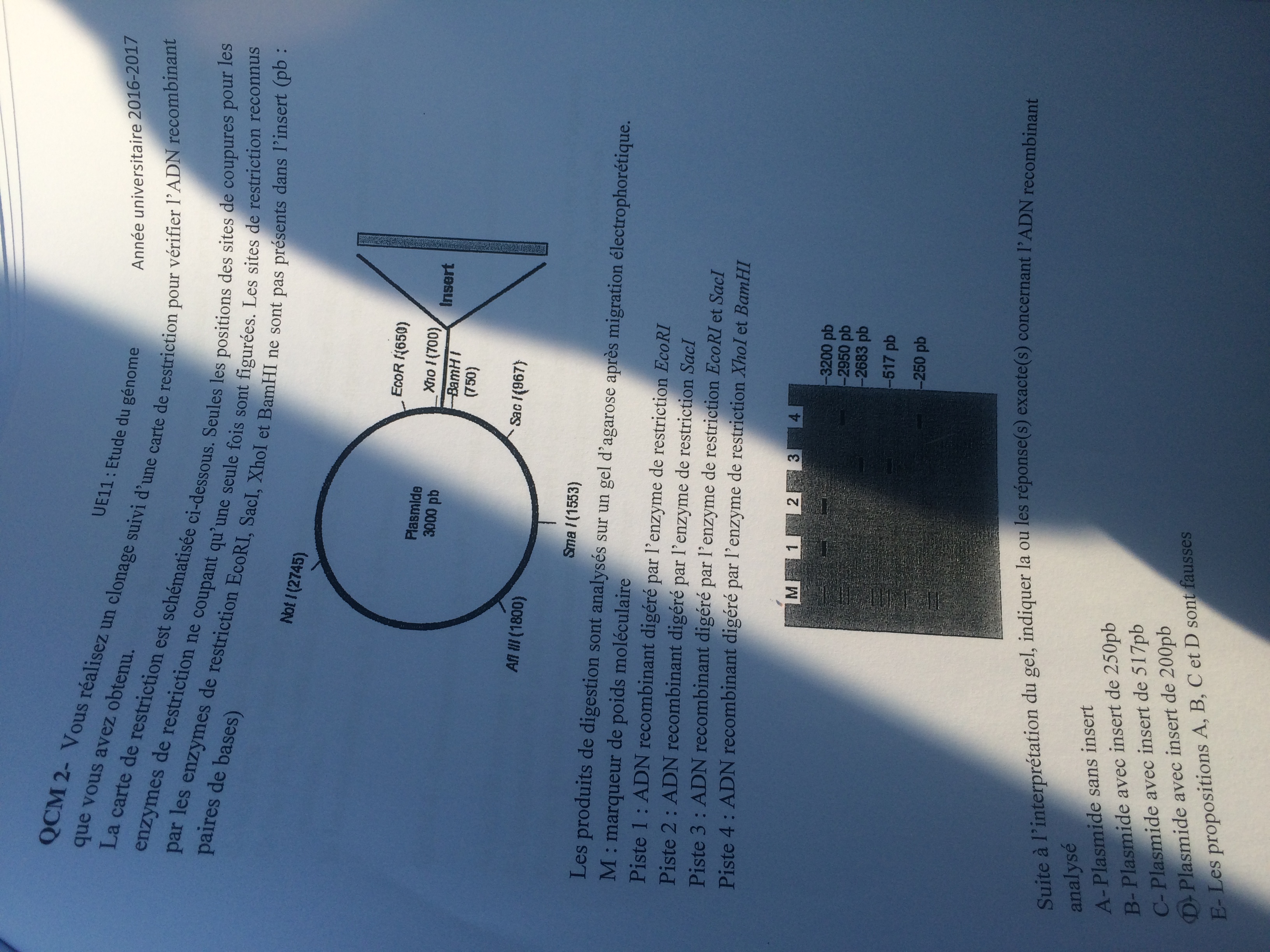 D) Vrai car Plasmide fait déjà 3000 pb donc avec l'insert, la taille sera automatiquement plus grande --> 200 pb