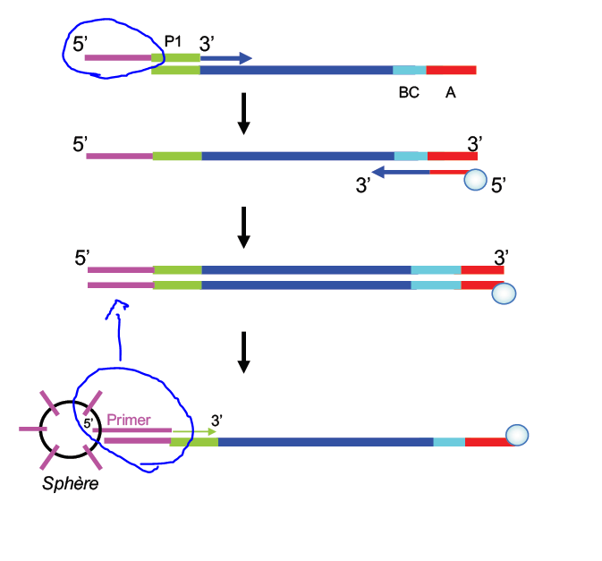 Mais j'ai un souci avec l'item A :confused: En effet celui-ci indique que la séquence supplémentaire en 5' du primer va s'hybrider sur la sphère, mais j'avais cru comprendre que le primer n'allait justement pas s'accrocher à la sphère, et que c'était plutôt l'ADN + biotine qui allait s'hybrider à la sphère !