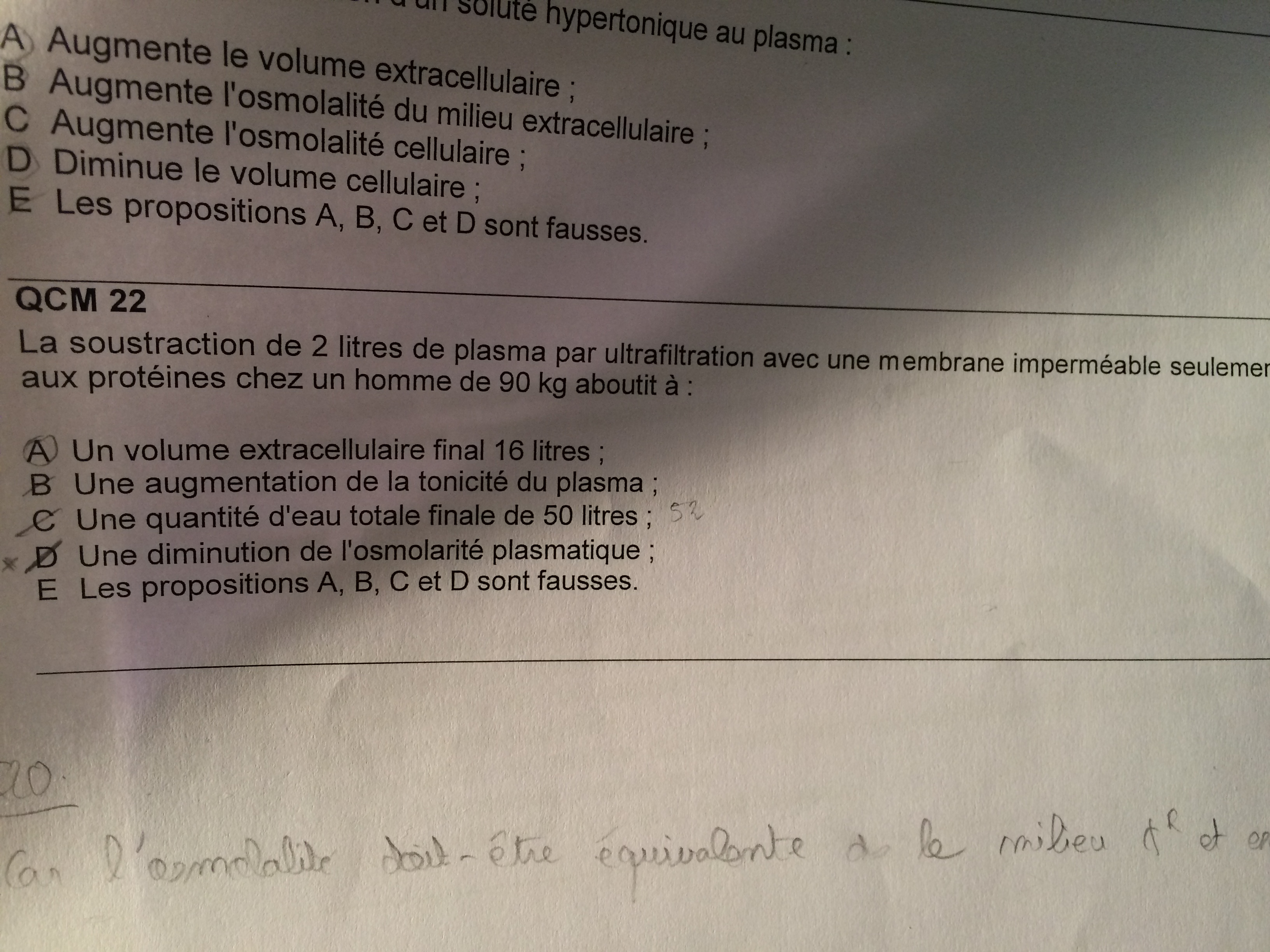 Comment savoir quand les pressions oncotique, hydrostatique et osmolaire varient (diminue, augmente, constante). De même pour l'osmolarité comme dans le QCM 20) item D)