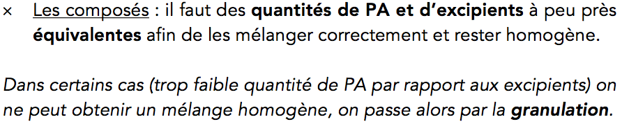 Salut ! D'après la version de l'an dernier, dans un mélange de poudre, il faut que les quantités de PA et d'excipients soient globalement équivalentes pour que le mélange reste homogène C'est ce que nous avons mis dans la fiche