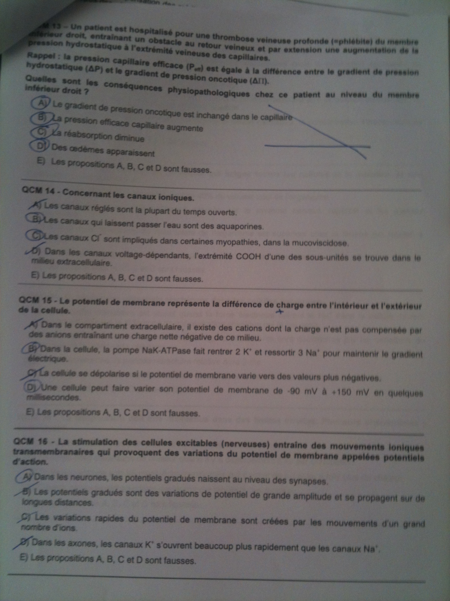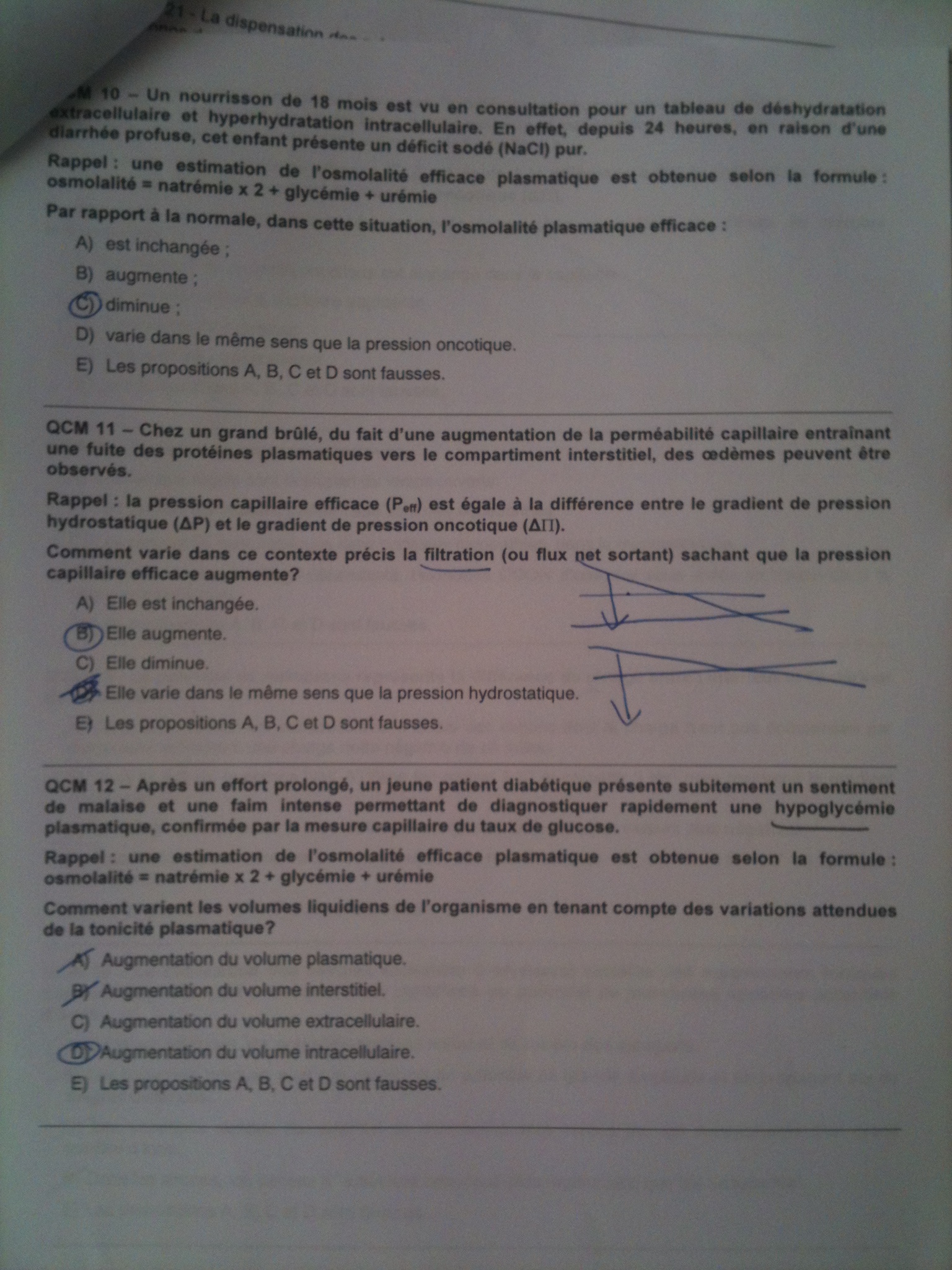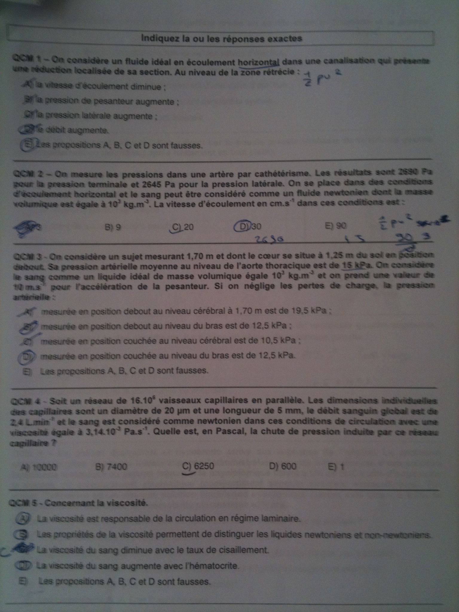 1E : la vitesse augmente / la pression de pesanteur est identique / la P latérale est identique, car effet Venturi / le débit reste identique